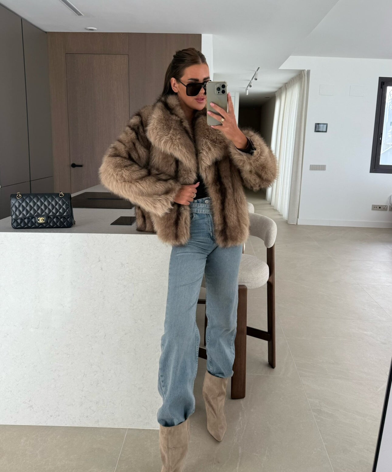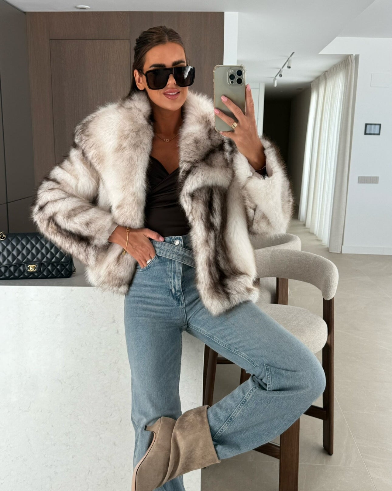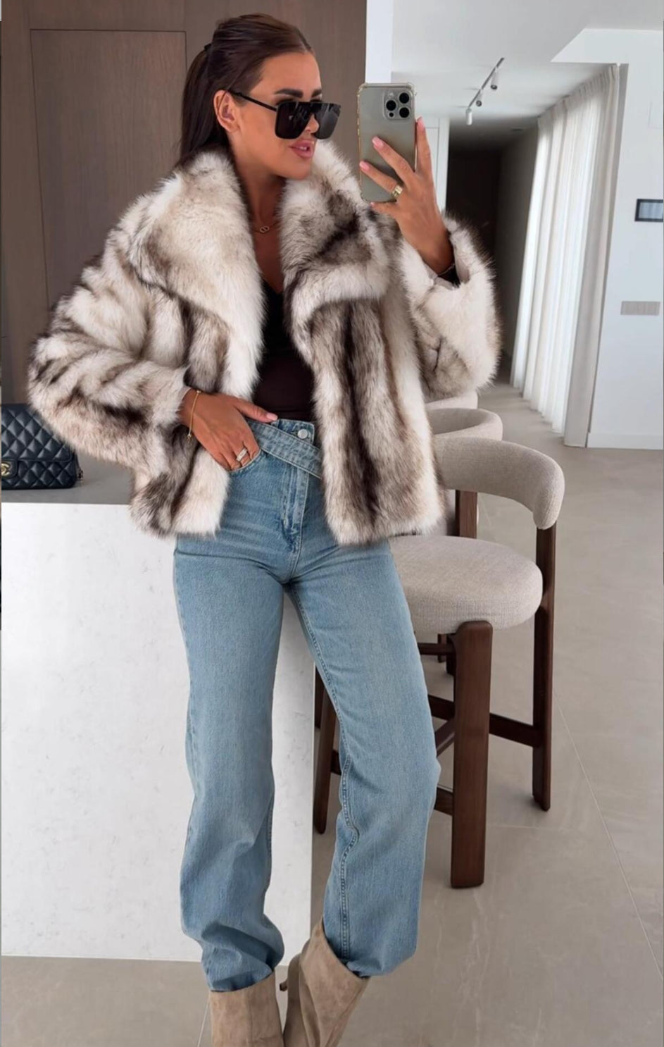 La Eco pelliccia VALESCA è realizzata con materiali ecologici di alta qualità per garantire un look elegante e moderno. Il collo ampio e la chiusura frontale discreta la rendono pratica e versatile, perfetta per ogni occasione. La sua vestibilità comoda e femminile la rende adatta a tutti i tipi di abbinamenti, dai jeans agli abiti eleganti.