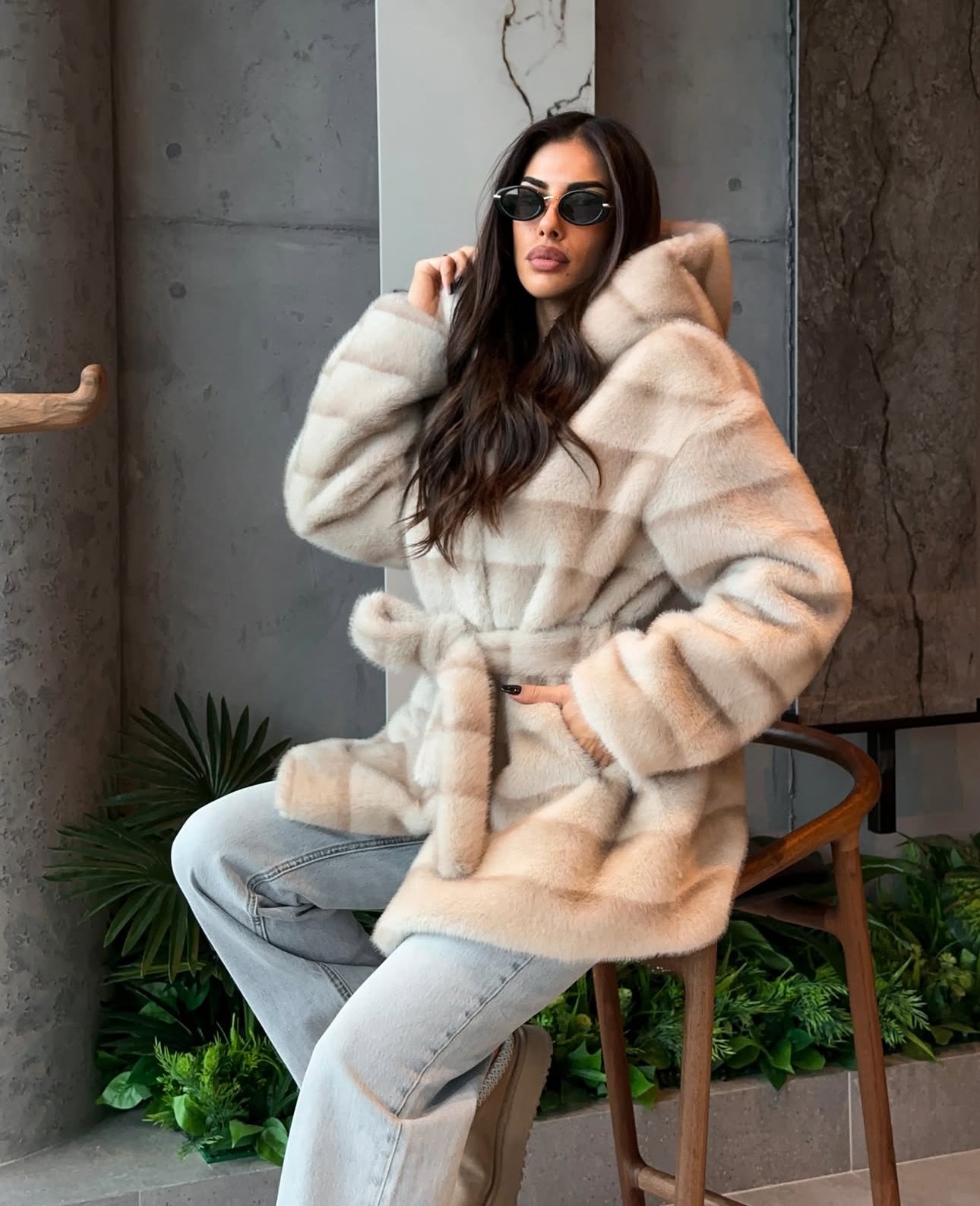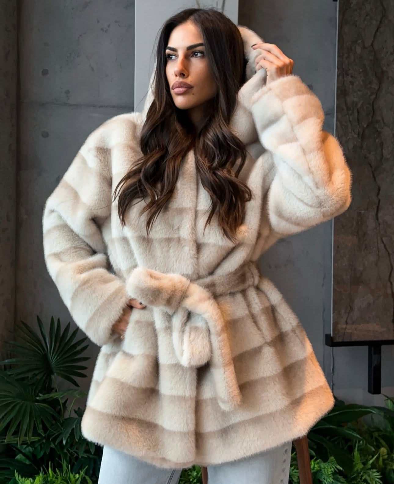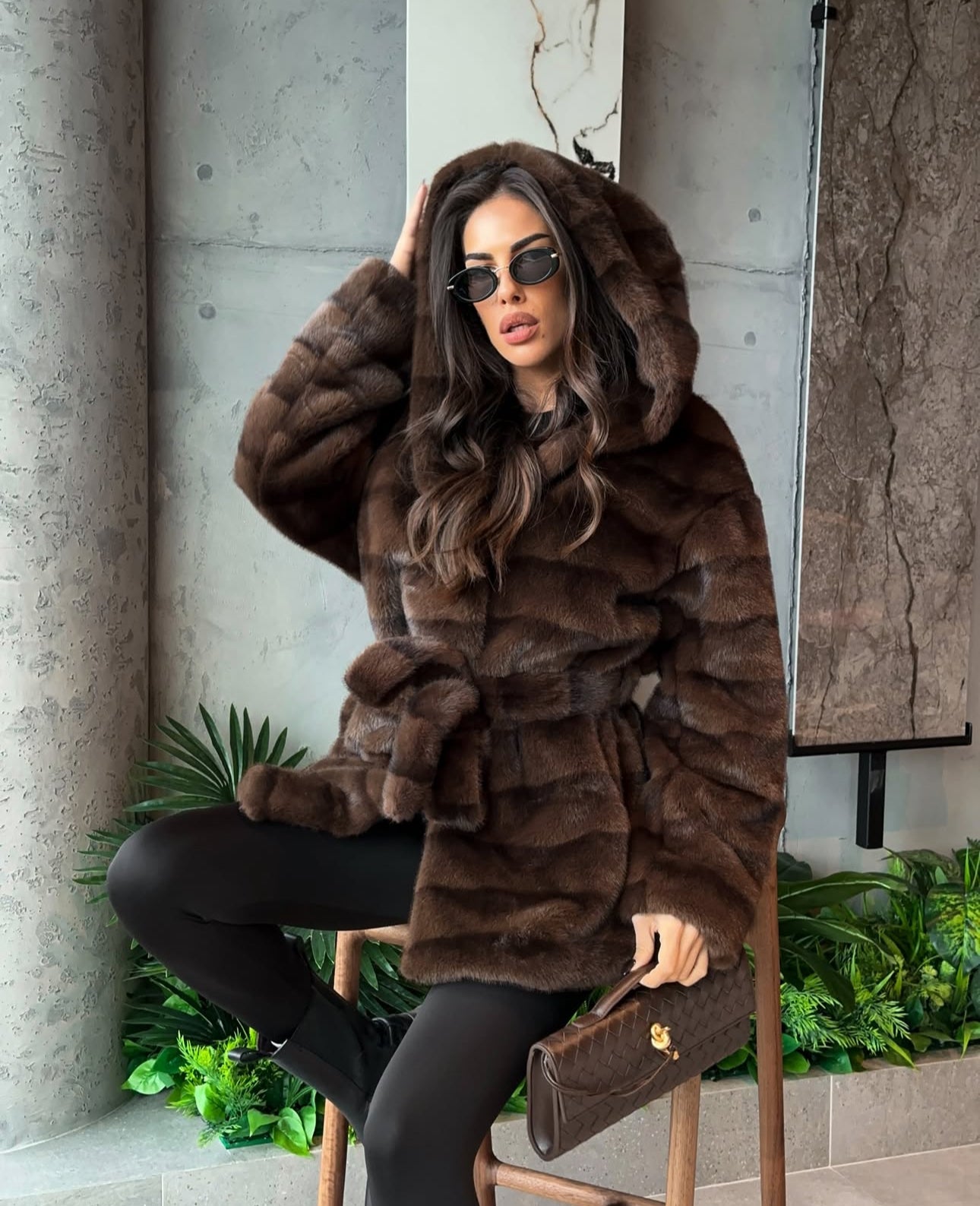 Pelliccia GIOIA in visone ecologico con cappuccio e cinta in coordinato