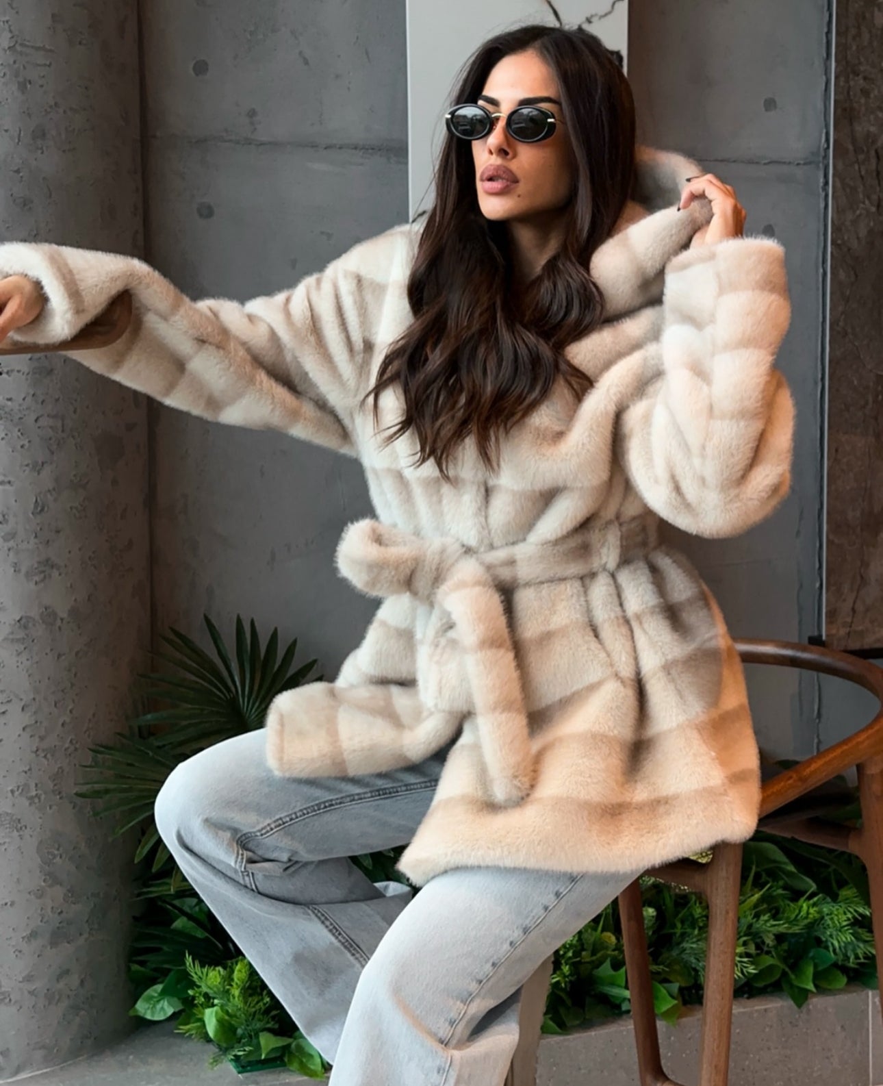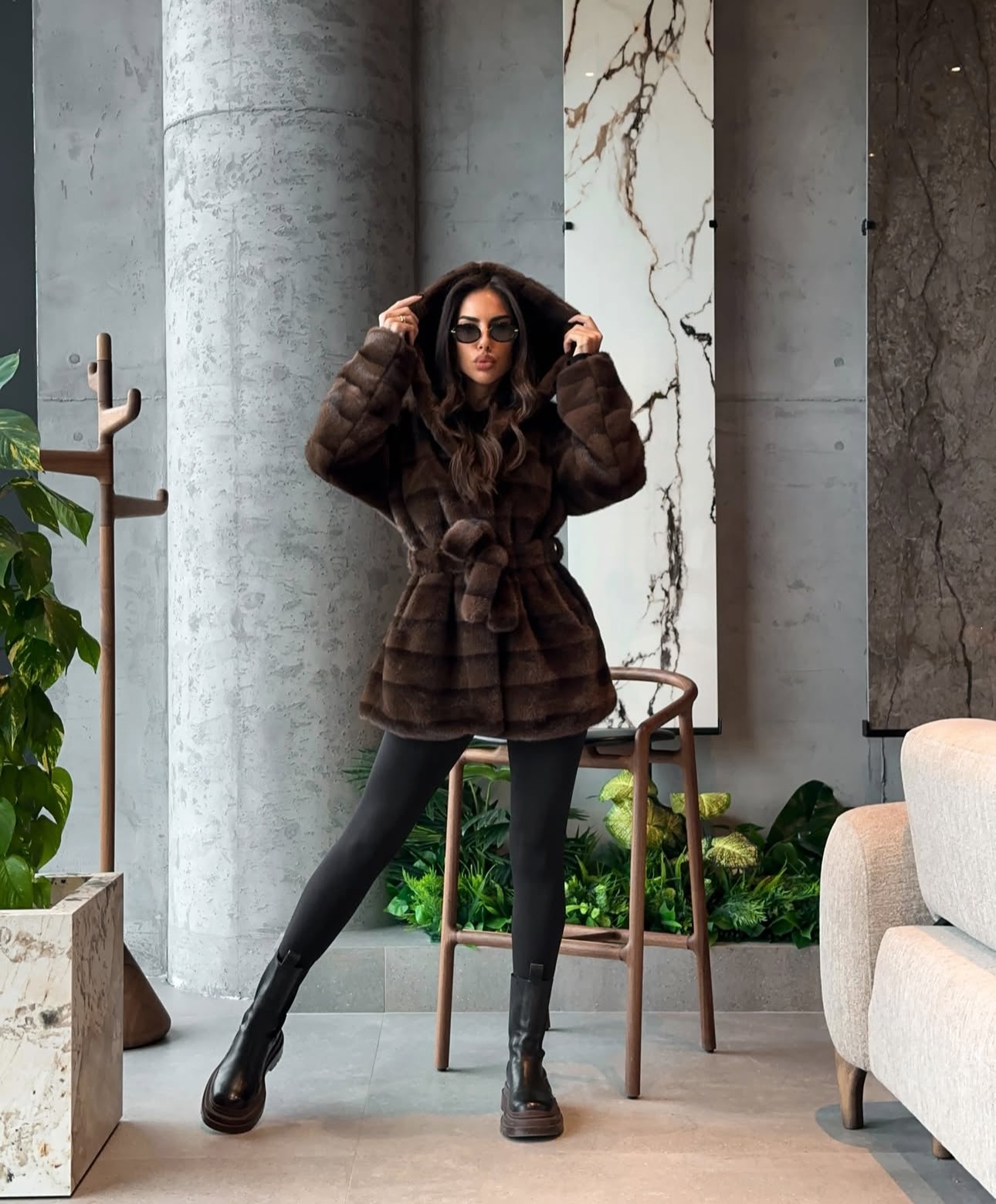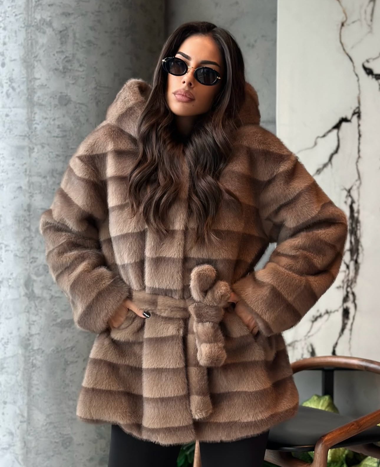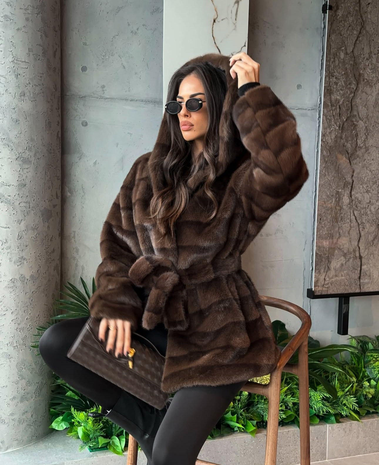 Pelliccia GIOIA in visone ecologico con cappuccio e cinta in coordinato